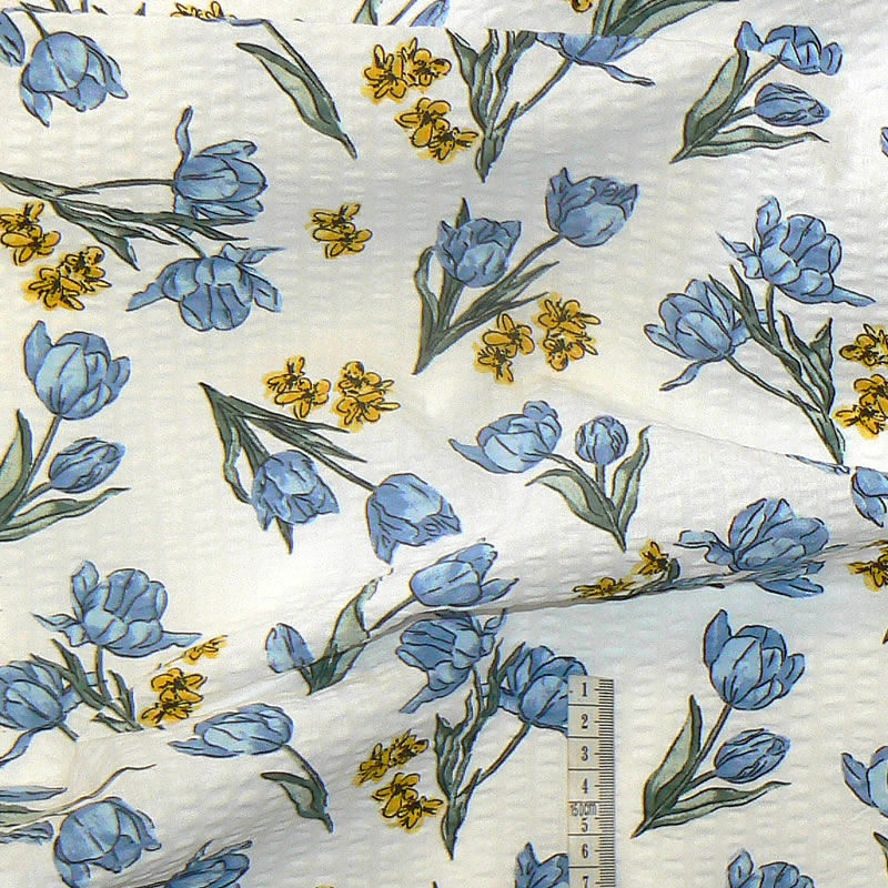 7F218 Bavlněný krep 17x142cm květy žlutomodrá zbytek na patchwork