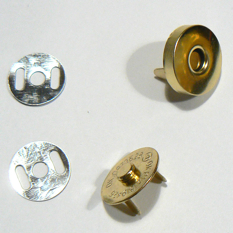 Magnetické zapínání s širokými možnostmi využití. Často se tento typ, zvaný magnetický buldok, používá u společenských kabelek s dekorativní přední klopou. Upevnění je snadné. Podle rozteče paciček zapínání do textilie či kůže vystřihneme dva úzké otvory, provlečeme jimi hlavní část, zezadu navlékneme protikus a zahnutím paciček upevníme na místě. A je to.